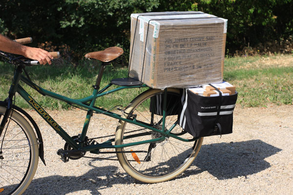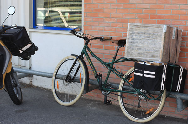 Super ce mode de transport, économique, écologique, bon pour moi, bon pour la planète … petit hic … il me faudrait une flottille de vélos cargo pour livrer en temps normal ! Mais sinon j’adore, il se pourrait bien qu’Univeda en achète un pour faire ses petites livraisons à la poste, ceci dit après un bref calcul, on devrait pouvoir transporter une bonne centaine de colis entre les sacoches géantes et un système de caisse sur le porte-bagage.