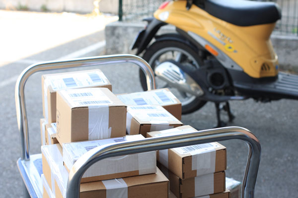 10 minutes plus tard (nous avons la chance d’habiter proche de la poste carré PRO) me voici garé à côté d’un des scooters de la poste. La classe ce vélo, moderne et rétro à la fois. Les colis sont intacts et n’attendent plus que le chariot de la poste.